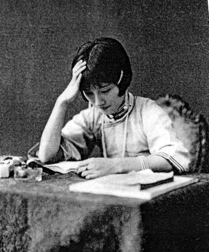 陆小曼在北京女中读书一直到14岁。我曾经查找到成立于1912年的北京第一女子中学当时所开设的课程,有国文、日文、英文、数学、物理、化学、体操、生物、劳动、图画、音乐、修身、历史、地理、国术,从中我们可以看到当时女子中学的教育是多么开放和丰富。陆小曼15岁时,又被父亲送到法国人开办的圣心学堂。这是一所贵族学校,当时北京军政界部长的千金小姐们,许多都在圣心学堂读书。陆定还专门为女儿请了一位英国女教师,教授英文。陆小曼生性聪慧,十六七岁已通英、法两国语言,还弹得一手好钢琴,又精于油画。她既有上海姑娘的聪明活泼,又有北京姑娘的秀丽端庄,在学校里,大家都称她为“皇后”。